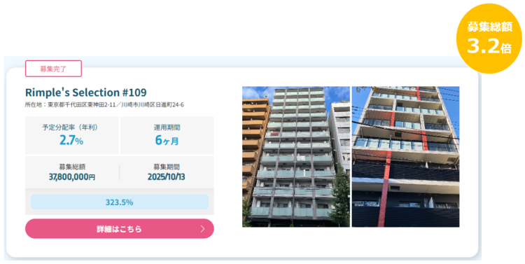 プロパティエージェントの展開する不動産クラウドファンディング Rimple’s Selection#109募集総額323.5%の1.22億円の応募