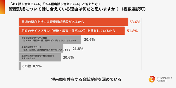 話し合えている理由として、「共通の関心を持てる資産形成手段がある」(53.6%)、「将来のライフプランを共有している」(51.8%)など、将来像を共有する会話が絆を深めていることがうかがえます。