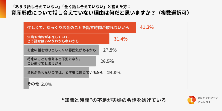 一方で、話し合えていない夫婦の理由としては「忙しくて時間が取れない」(41.2%)が最多。