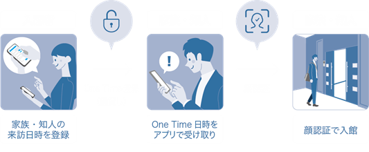さらに、One Time(鍵貸し)機能により同居しない家族や知人にも鍵を貸し出すことができ、より安全で快適なスマートなマンションライフを実現します。