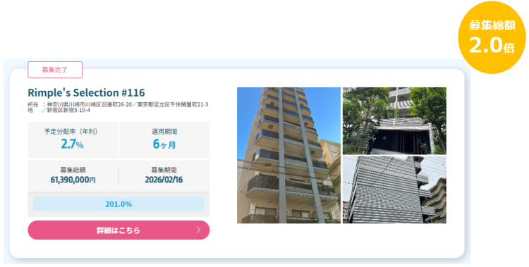 プロパティエージェントの展開する不動産クラウドファンディング Rimple’s Selection#116募集総額201%の1.23億円の応募