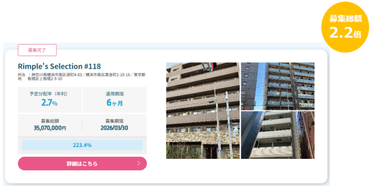 プロパティエージェントの展開する不動産クラウドファンディングRimple’s Selection#118募集総額223.4%の7,836万円の応募